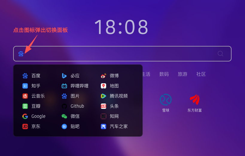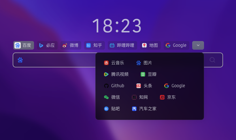 主页搜索区域,根据页面布局的宽度,自动计算可排列的搜索引擎数量,超出的隐藏,通过点击下拉按钮展示更多搜索。