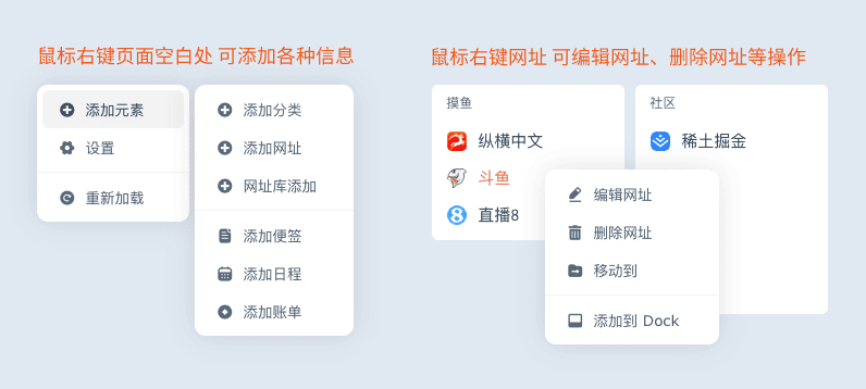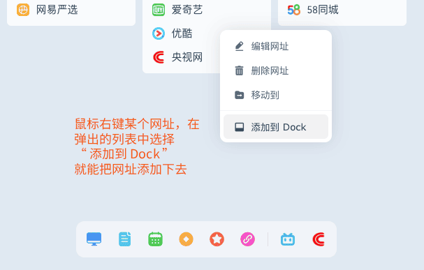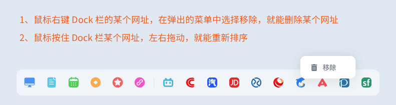 这里参考了 mac 系统程序坞设计,在页面底部增加额外的醒目的网站放置,可自主添加、删除、排序。