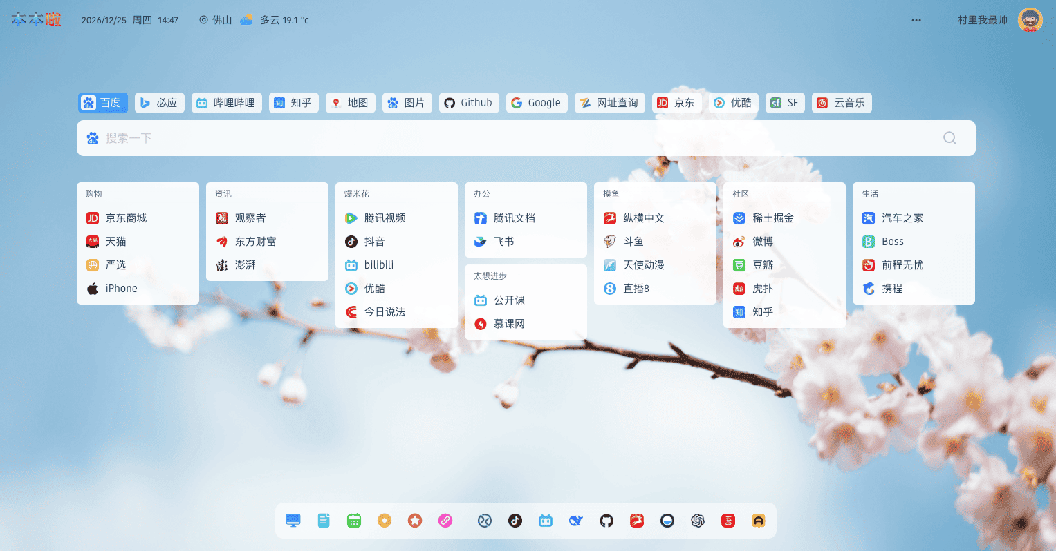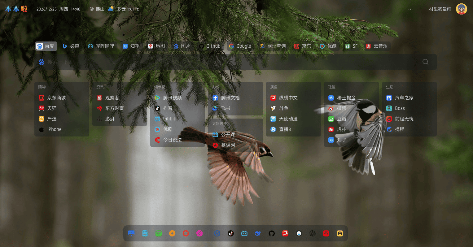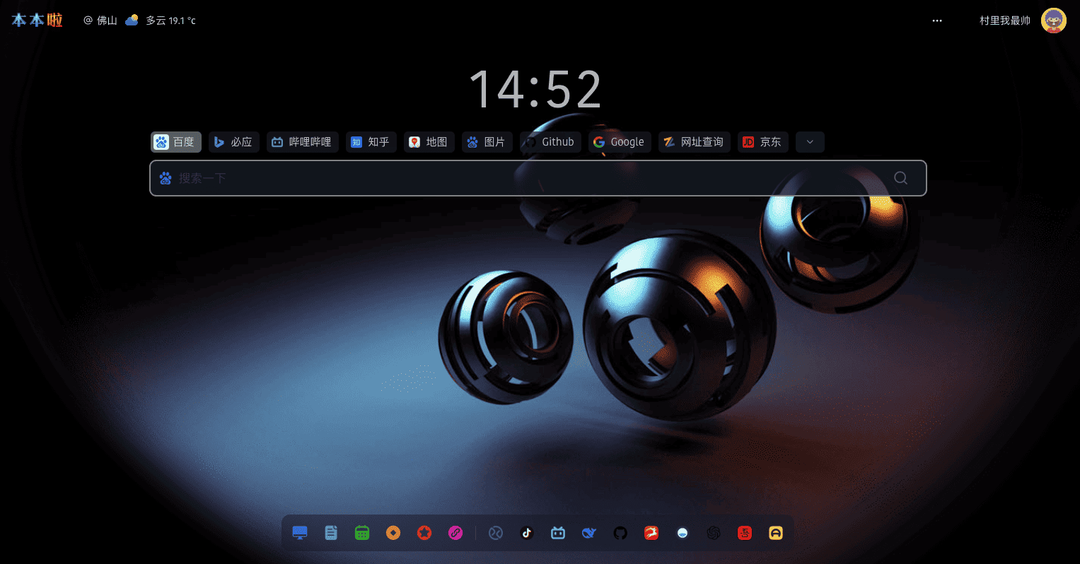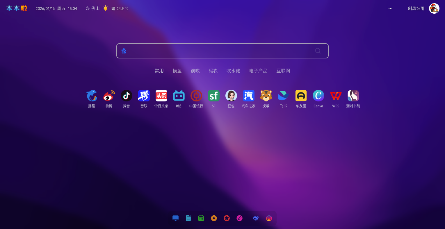 本本啦主页定位为一个简单实用 、多功能、高度自定义的 个人上网主页 。 界面简洁,支持全自定义网址、搜索、布局、主题、Dock栏等设置。