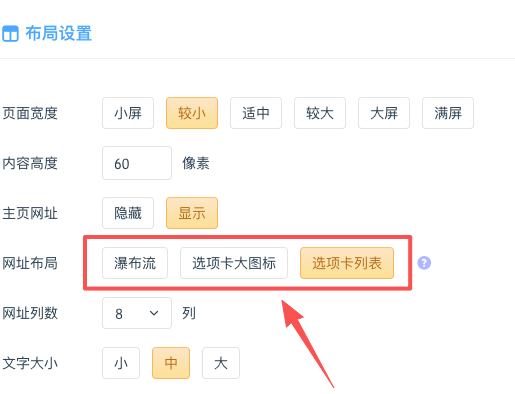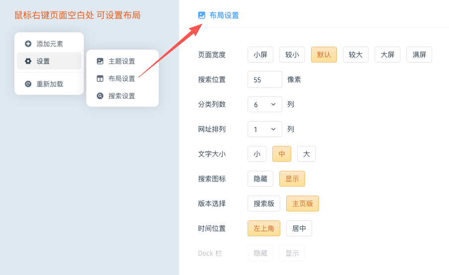 布局设置支持 搜索框高度、文字大小、主页宽度、分类列数、分类网址列数、搜索图标、Dock栏、居中时间 等设置。