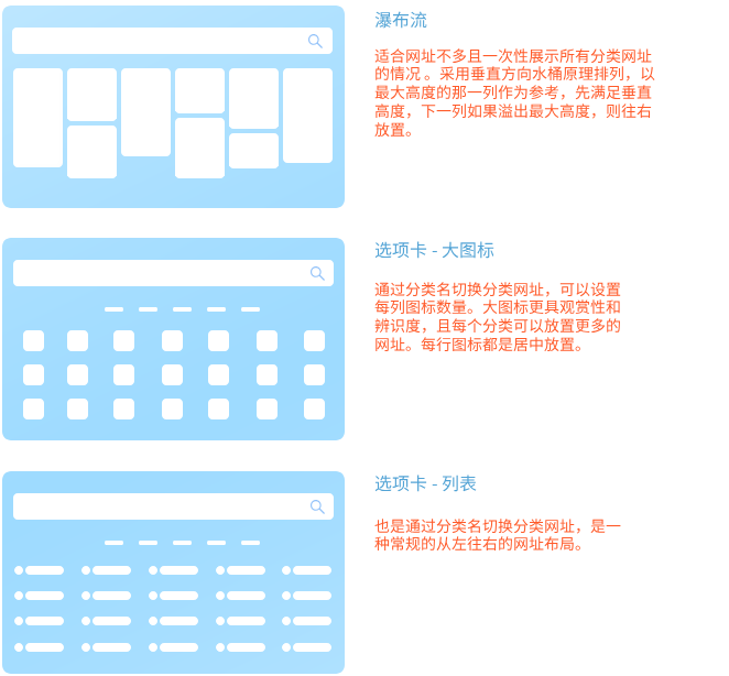 当前支持三种布局模式:瀑布流 、选项-大图标 、选项-列表