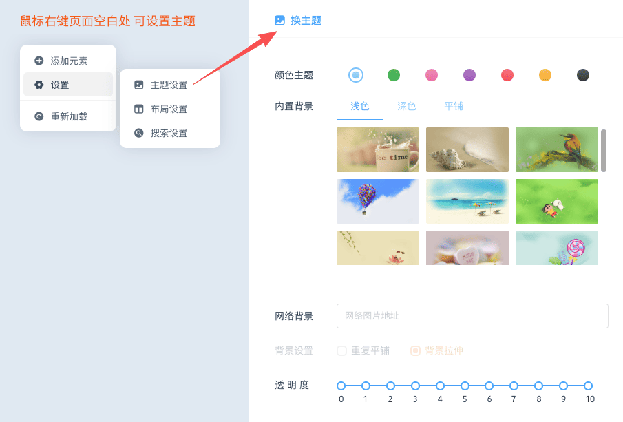 支持多种颜色主题切换,背景图切换,自定义背景图,以及透明度调节等。