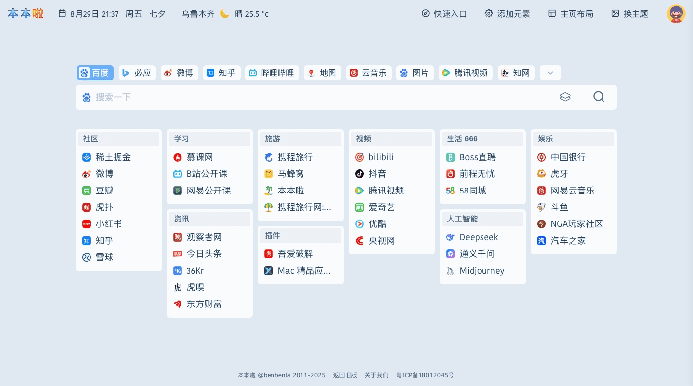 新版本本啦是一个非常轻便且适合所有电脑用户使用的 个人主页 ,支持全自定义网址、搜索、布局、主题等设置。