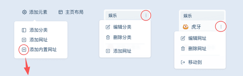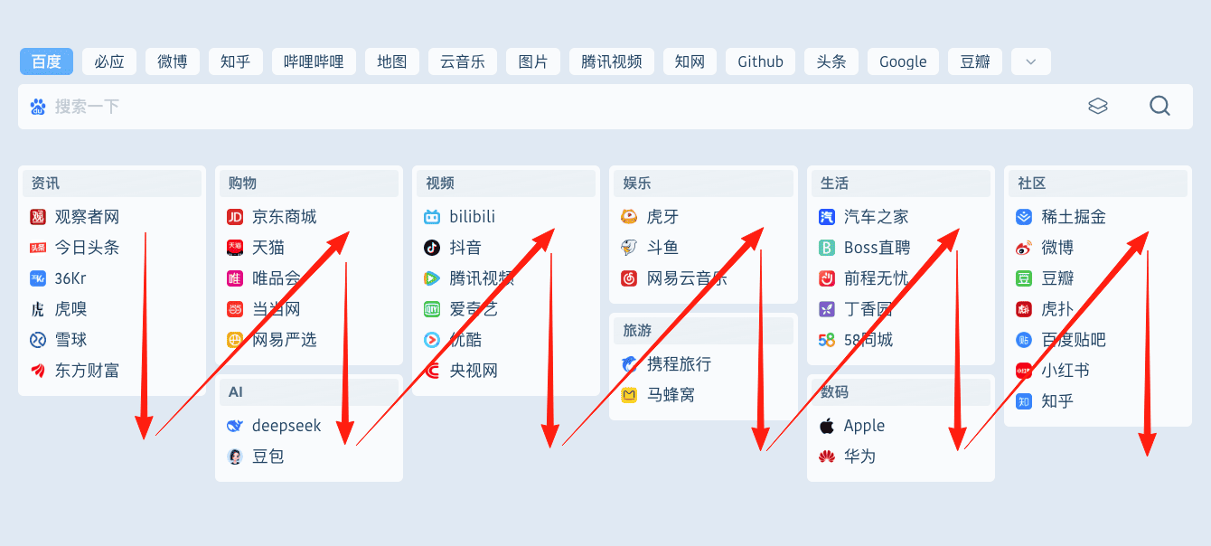 鼠标左右拖动,可调整分类排列顺序;分类里上下拖动网址 ,可调整网址顺序 。配合浏览器插件 你可以更加快速地添加你所要的网址。