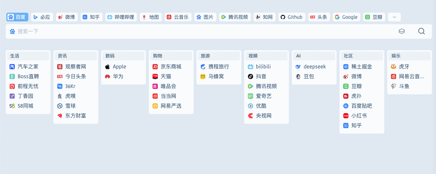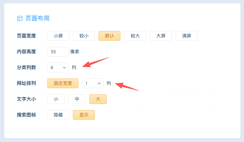 布局设置支持自定义搜索框高度,修改文字大小、主页内容宽度、分类列数、分类网址列数、搜索图标等设置。