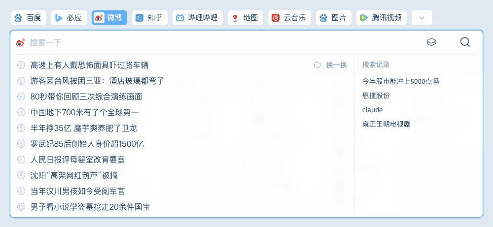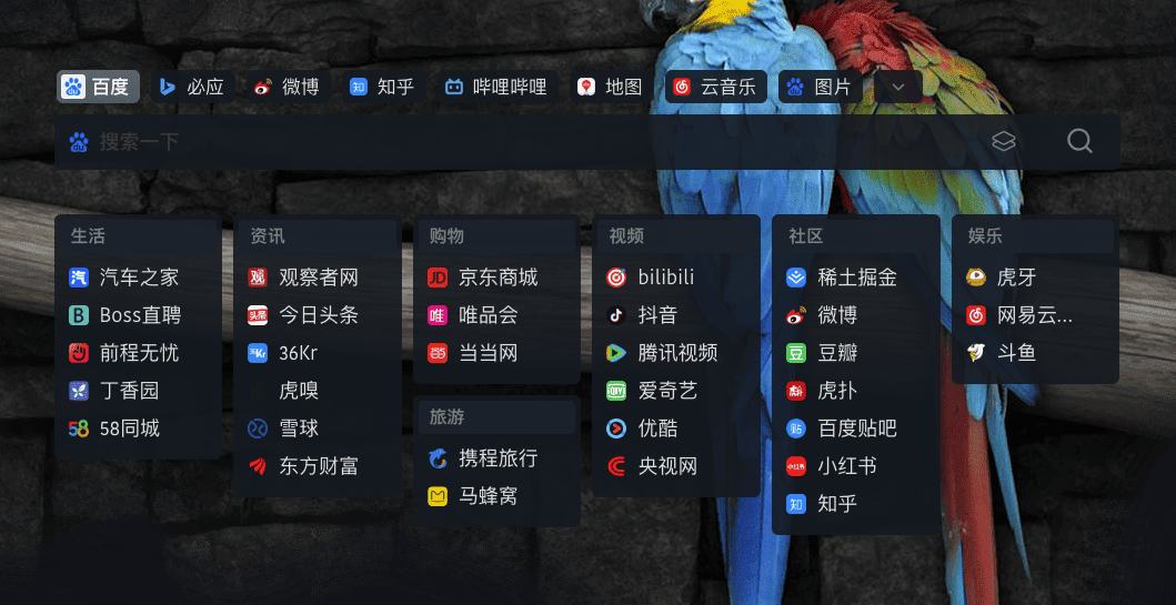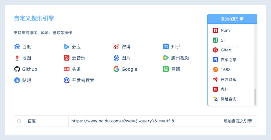主页搜索区域,根据页面布局的宽度,自动计算可排列的搜索引擎数量,超出的隐藏,通过点击下拉按钮展示更多搜索。
