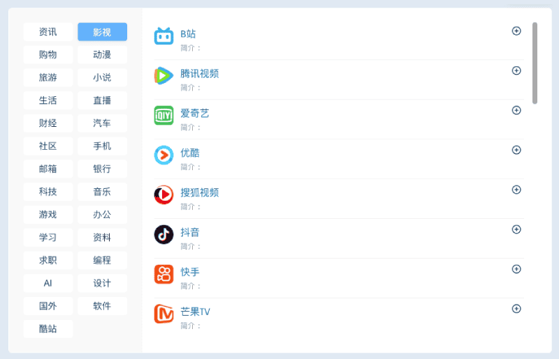 内置各分类主流网站,一键添加,非常方便