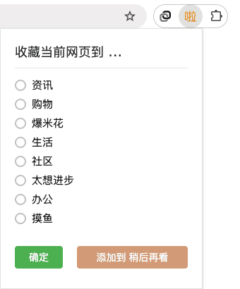 登陆后,打开某个网站,再点击插件图标,你会首先看到你的主页的分类,再把当前打开的某个网站收藏到主页,或者收藏到稍后再看。