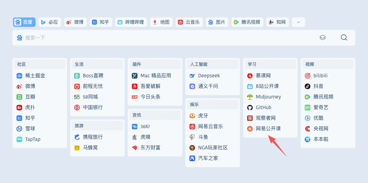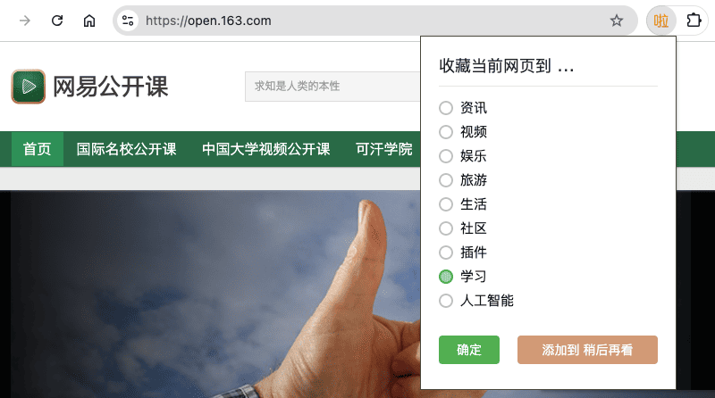 假设你要收藏 「 网易公开课 」 只需点击右上角插件图标,选中你要存储的分类,按确定,马上就保存到首页展示。