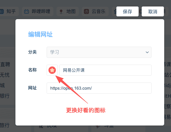 如果你不喜欢默认图标,可以编辑网址,通过内置丰富的图标库,挑选你喜欢的图标