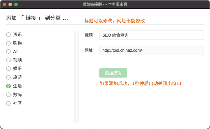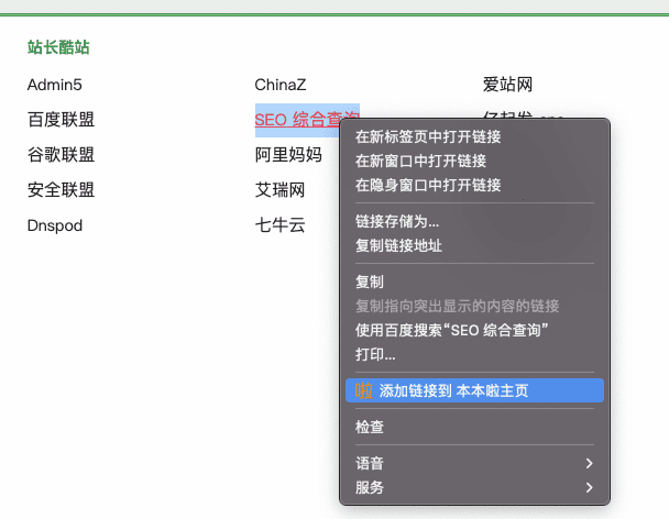 通过鼠标右键文字链接,在弹出面板中选择 ‘添加链接到本本啦主页’,在弹出的新窗口中,